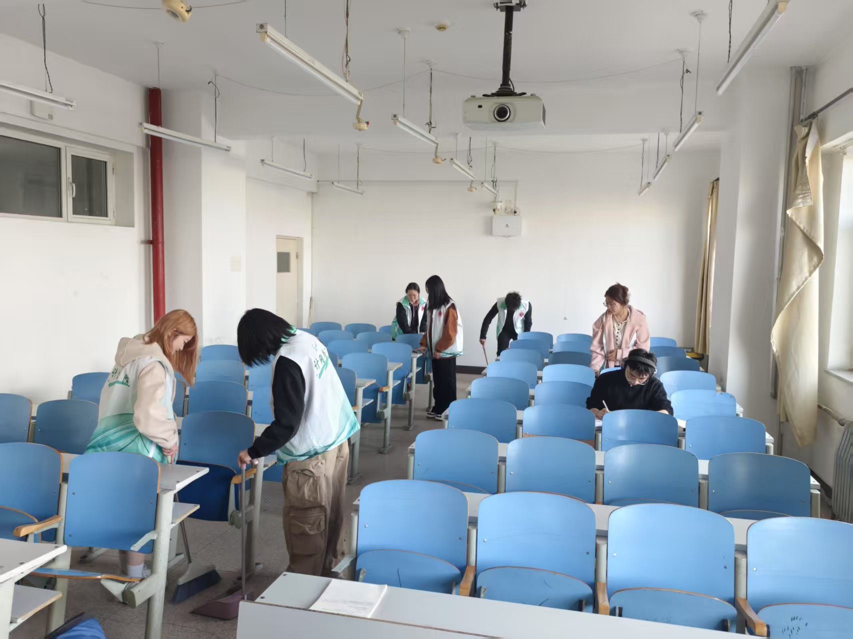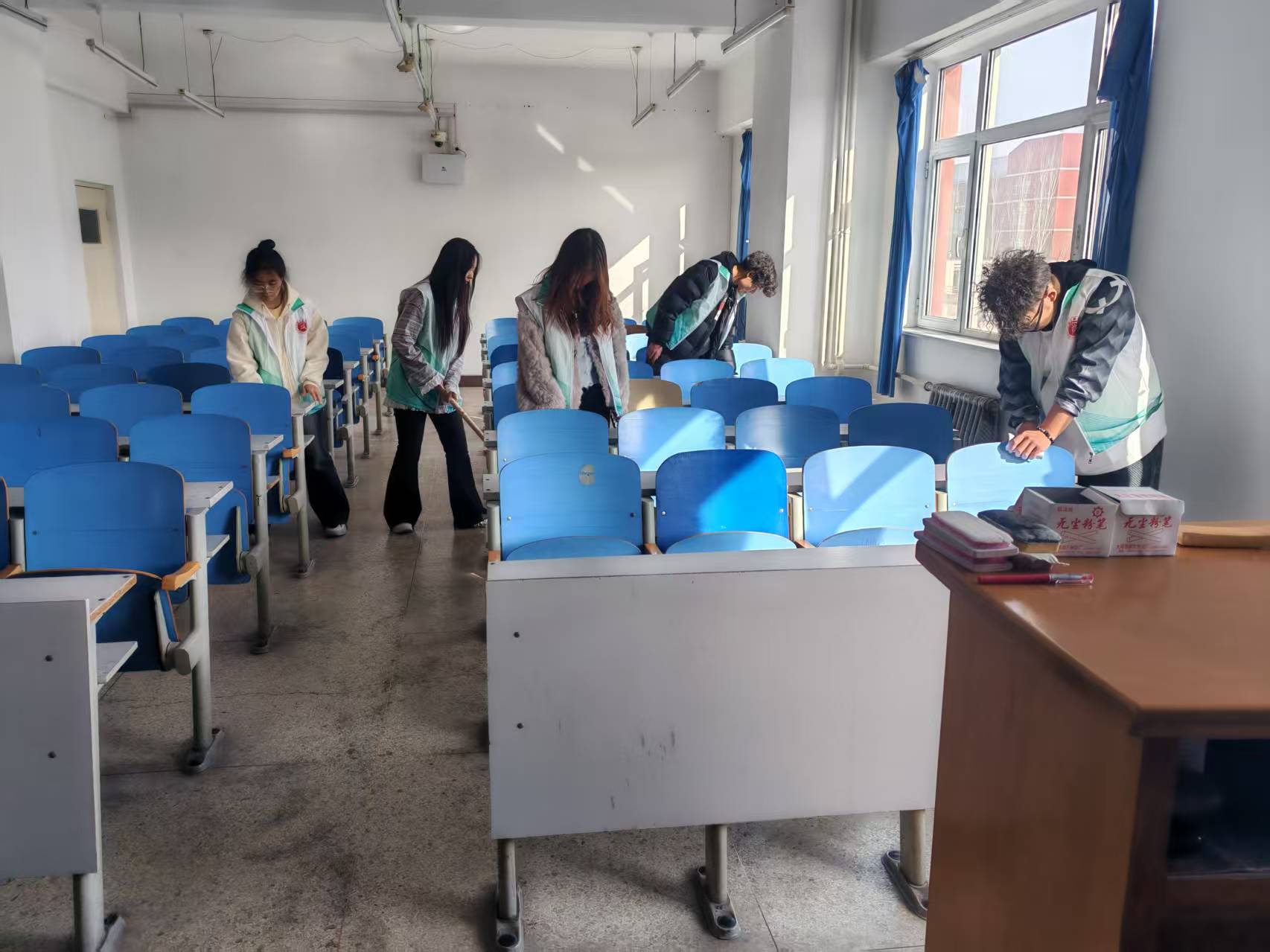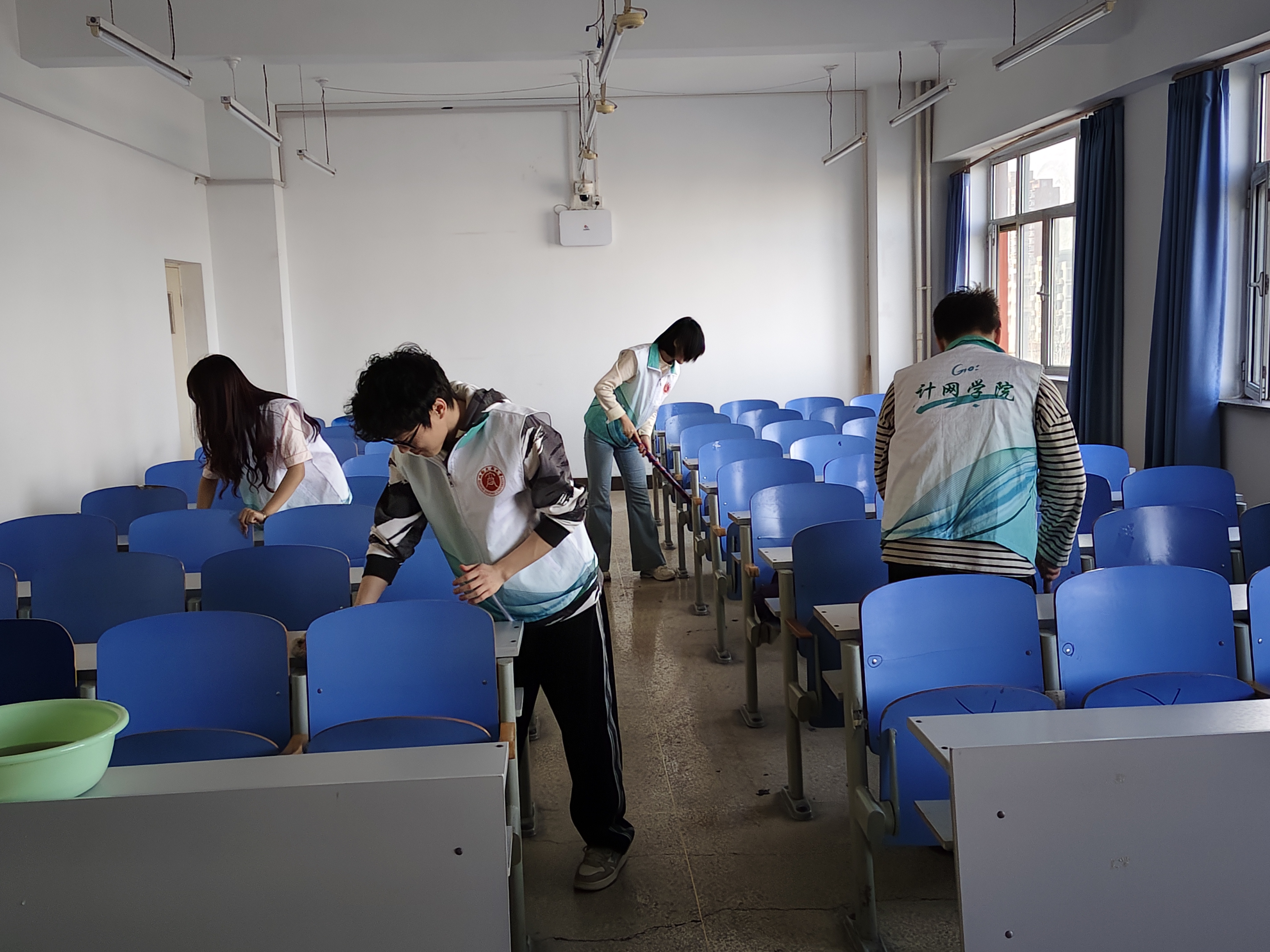 作为共青团工作的中坚力量,团干们以身作则,主动揽下教学区的打扫工作,经过一个寒假的尘封,窗台上的积灰、角落里的杂物,无不展现着这个任务的艰巨,但他们充满坚定的眼神以及活跃在窗棂缝隙间的身影,成为暖化冬日的一道阳光,用汗水与行动诠释了“奉献、友爱、互助”的志愿精神,映照着青年骨干"做一颗永不生锈螺丝钉"的铮铮誓言。