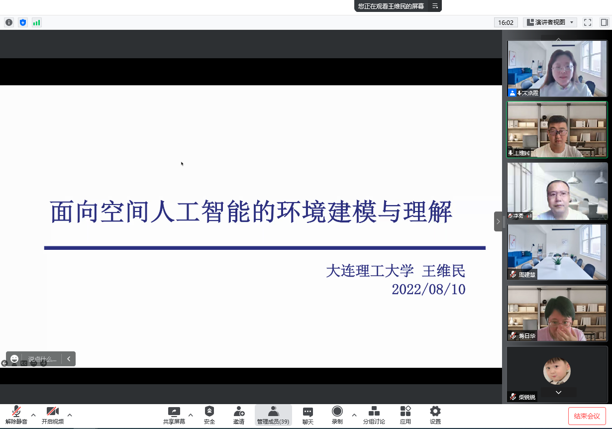 8月10日下午16时,大连理工大学王维民副教授应邀在我院作了题为“面向空间人工智能的环境建模与理解”的线上学术讲座。我院相关专业教师和学生聆听了讲座,报告会由院长宋晓霞主持。