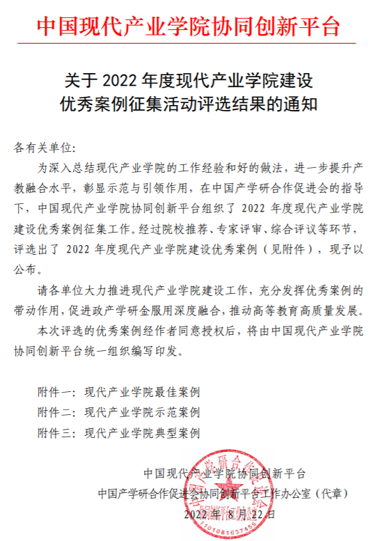 8月22日,中国现代产业学院协同创新平台、中国产学研合作促进会对2022年度现代产业学院建设优秀案例评选结果进行了公示。此次评选历时6个月,经过院校推荐、专家评审、综合评议等环节,评选出了2022年度现代产业学院最佳案例、现代产业学院示范案例和现代产业学院典型案例共67家现代产业学院建设优秀案例。